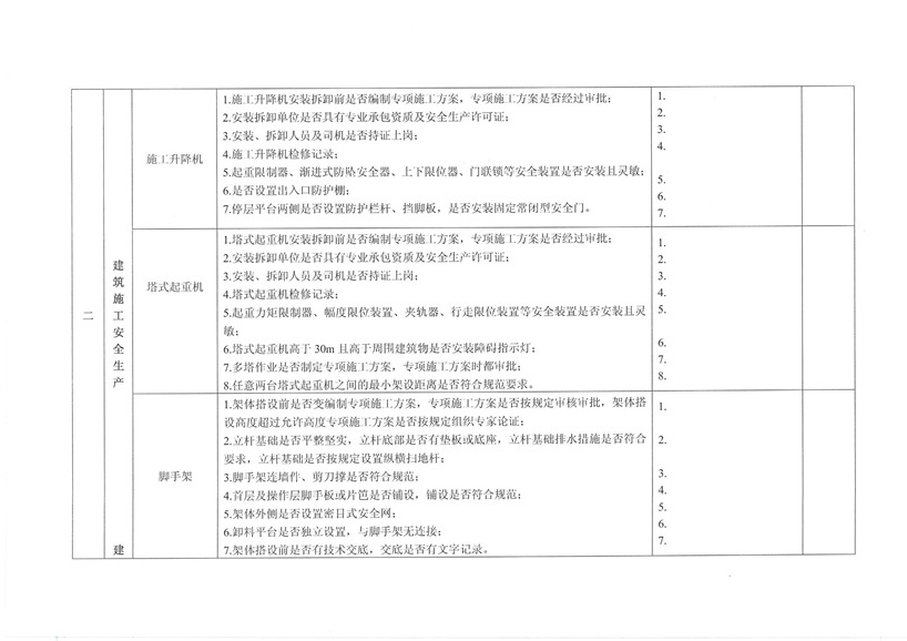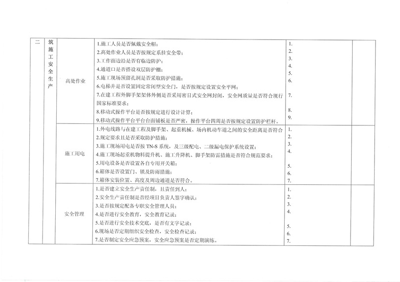 集團(tuán)公司各部室、分公司、項(xiàng)目部: 為繼續(xù)深入開(kāi)展工程質(zhì)量治理兩年行動(dòng),進(jìn)一步加強(qiáng)工程安全、質(zhì)量規(guī)范管理,保障廣大農(nóng)民工合法權(quán)益,促進(jìn)項(xiàng)目工程穩(wěn)固進(jìn)展。公司決定對(duì)各在建工程開(kāi)展秋季安全、質(zhì)量、勞務(wù)及工程質(zhì)量治理“兩年行動(dòng)”綜合大檢查,現(xiàn)將相關(guān)事宜通知如下: 一、檢查時(shí)間安排 2015年10月30日—2015年11月10日 二、檢查組成員 組 長(zhǎng):張濤 副組長(zhǎng):王健 組 員:胡巨偉(負(fù)責(zé)兩年行動(dòng)、市場(chǎng)檢查,周文淵配合) 陳治明(負(fù)責(zé)勞務(wù)管理,肖家駿配合) 張亞偉(負(fù)責(zé)安全生產(chǎn)管理,李芬芬、藺濤配合) 王 軍(負(fù)責(zé)質(zhì)量管理,王坤海配合) 三、檢查內(nèi)容 1、安全生產(chǎn) (1)項(xiàng)目部安全生產(chǎn)管理制度、廣域網(wǎng)IFA考勤工作及安全管理人員落實(shí)情況; (2)深基坑、高支撐、高處作業(yè)等危險(xiǎn)性較大的分項(xiàng)工程方案編制、審批、專(zhuān)家論證及施工防護(hù)情況; (3)塔吊、施工升降機(jī)全過(guò)程安全監(jiān)控落實(shí)和備案、檢測(cè);施工機(jī)械設(shè)備維修、保養(yǎng)臺(tái)賬落實(shí)情況; (4)腳手架、臨邊洞口防護(hù)、臨時(shí)用電布置情況; (5)文明施工、揚(yáng)塵防治、企業(yè)形象建設(shè)情況; (6)特種作業(yè)人員持證上崗、農(nóng)民工學(xué)校及工人安全教育落實(shí)情況; (7)安全資料同步整理情況。 2、質(zhì)量管理 (1)施工現(xiàn)場(chǎng)質(zhì)量管理人員及制度建設(shè)落實(shí)情況; (2)工程資料收集及歸整情況; (3)質(zhì)量通病防治情況; (4)強(qiáng)制性標(biāo)準(zhǔn)執(zhí)行情況; (5)現(xiàn)行節(jié)能標(biāo)準(zhǔn)執(zhí)行及施工質(zhì)量管理狀況; (6)原材料進(jìn)場(chǎng)取樣檢測(cè)及質(zhì)量標(biāo)準(zhǔn)化建設(shè)執(zhí)行情況。 3、勞務(wù)管理 (1)施工現(xiàn)場(chǎng)是否按公司規(guī)定設(shè)立《民工維權(quán)告示牌》; (2)勞務(wù)班組分包合同、農(nóng)民工勞動(dòng)合同(應(yīng)附有身份證明); (3)農(nóng)民工工資保障金繳納憑證; (4)農(nóng)民工用工花名冊(cè)、考勤記錄表、工資發(fā)放清單、農(nóng)民工工資發(fā)放是否公示; (5)項(xiàng)目部是否安排專(zhuān)人負(fù)責(zé)管理農(nóng)民工工資支付工作; (6)現(xiàn)場(chǎng)了解農(nóng)民工工資發(fā)放情況。 4、工程質(zhì)量治理兩年行動(dòng) (1)施工現(xiàn)場(chǎng)是否設(shè)立專(zhuān)人負(fù)責(zé)工程質(zhì)量治理兩年行動(dòng); (2)施工現(xiàn)場(chǎng)工程質(zhì)量治理兩年行動(dòng)資料是否完整; (3)現(xiàn)場(chǎng)資料是否按上級(jí)主管部門(mén)下發(fā)文件及表格進(jìn)行整理。 各項(xiàng)目部接到通知后應(yīng)將文件內(nèi)容傳達(dá)至各項(xiàng)目管理人員,并立即開(kāi)展自查自糾,高度重視本次檢查。同時(shí)各項(xiàng)目負(fù)責(zé)人、項(xiàng)目經(jīng)理及勞務(wù)專(zhuān)員應(yīng)切實(shí)保障農(nóng)民工工資按月足額發(fā)放,杜絕拖欠農(nóng)民工工資行為的發(fā)生。在對(duì)本次檢查中發(fā)現(xiàn)的問(wèn)題公司將下發(fā)限時(shí)整改通知單,對(duì)不按時(shí)整改、不回單、現(xiàn)場(chǎng)較差的項(xiàng)目部公司將進(jìn)行通報(bào)批評(píng)和嚴(yán)厲處罰。 二〇一五年十月二十六日